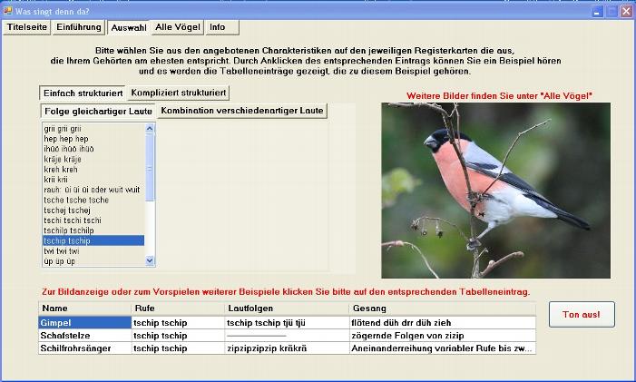 Wie man schon einschätzen kann, ist die buchstäbliche Beschreibung von Vogelgesängen nicht gerade einfach und schon gar nicht eindeutig. Dennoch werden solche Lautmalereien in jedem Vogelbuch angeführt. Etwas Phantasie und Geduld ist dabei schon nötig! Aber, das Programm spielt sofort beim Anklicken der jeweiligen Gesangsbeschreibung die sich dahinter versteckenden wirklich realistischen Laute der Vögel vor. Man kann sich also Durchklicken und Durchhören.